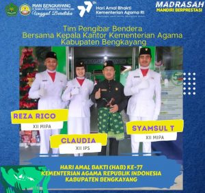 Sanggau ledo_Bengkayang. Sebanyak 3 anggota Paskibra MAN Bengkayanv yang tergabung dalam Pasukan Pengibar Bendera (Paskibra) sukses dalam menjalankan tugasnya untuk mengibarkan Bendera Merah Putih pada Peringatan Hari Amal Bakti (HAB) Kementrian Agama ke 77 Kabupaten Bengkayang Senin (3/1/2023) di Halaman Kantor Kementrian Agama Kab.Bengkayang.