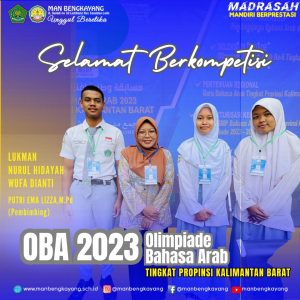 Pelaksanaan Olimpiade Bahasa Arab (OBA) ini mencapai tahapan seleksi tingkat provinsi. Pada hari Sabtu (23/9/2023) kegiatan dilaksanakan di MTsN 1 Pontianak. Siswa MAN Bengkayang yang mengikuti kegiatan tersebut yaitu Lukman XII MIPA, Nurul Hidayah dan Wufa Dianti XI MIPA.